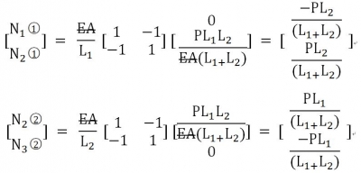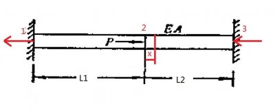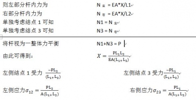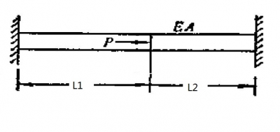 假設一均勻直桿,彈性模量E,截面積A,長度2L兩端固定,在中間位置施加一向右的載荷P,求直桿內應力。
