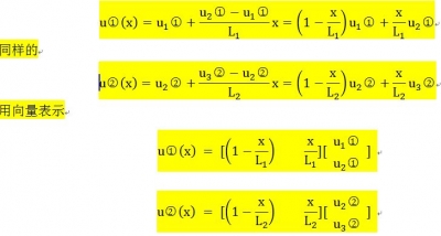 到現在位置我們并沒有使用黃色背景部分的公式,它起什么作用呢?目前我們能得到的是各結點的位移,各點的受力,以及桿的內力及內應力(此時因為個單元內部的應力處處相等),那如何求得單元內部各處的位移呢?那就得使用黃色部分的內容了。比如單元