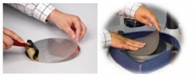 金相砂紙背面,然后用滾刷輕輕地將空氣擠壓出去,薄膜就牢牢的吸附在了金相砂紙上。然后再將砂紙平貼在磨盤上,ok!可以放心的研磨了!有一個小小的注意事項,就是貼敷薄膜時,要從一側平行推進,逐漸將里面的空氣擠出,則兩個貼合面就牢牢的貼合在一起了。如果不用手將邊緣撬起,是很難分開的。用過后,需要更換時,將邊緣先撬起,整個薄膜就從砂紙或磨盤上分離開了,沒有任何殘留。想不到,用了幾十年的卡箍和背膠,今天可以升級為吸附膜了,干凈,易更換,環保,真是太好用了!