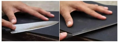 將用舊的金相砂紙捋平,平鋪到桌子,臺面或砧板的邊緣。如上圖所示,左手按住金相砂紙,右手執刀柄,刀刃和金相砂紙平面成30度-40度角,前后摩擦,分別打磨刀刃的兩個面,一會兒功夫就能把刀磨的飛快,無論你是切肉、切魚、還是切菜,一個字兒“快”!