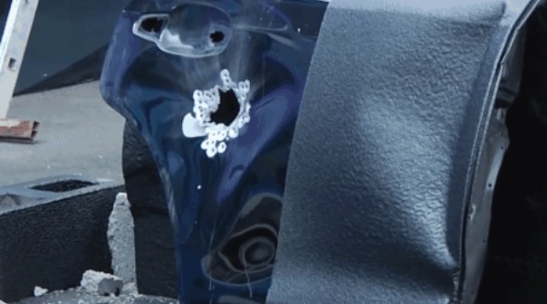 車殼左邊是普通涂料,一下子就被打穿;右邊是噴了LINE-X,幾乎沒有損傷。