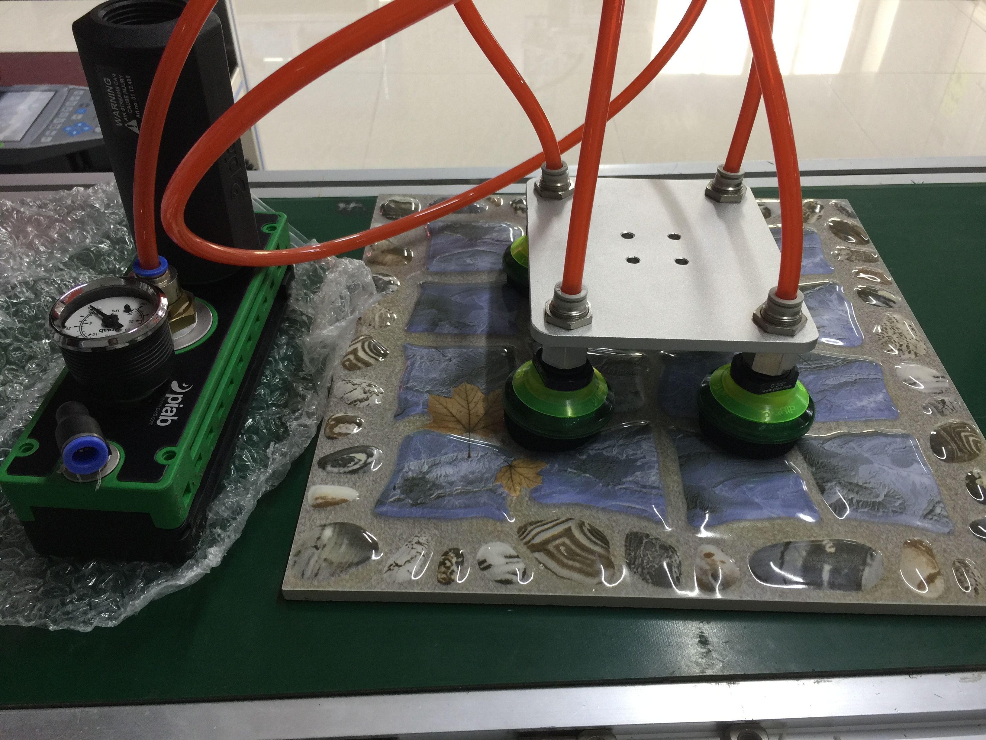 1. 如果是瓷磚工廠抓取(裝盒、碼垛),由于現場環境不算好,粉塵多。真空系統需要配好真空過濾,并且必要的時候在氣路中增加吹氣功能,以便保護發生器及相關閥門;