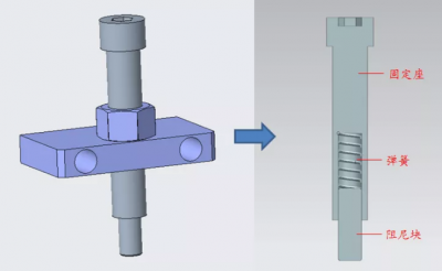阻尼機構:關于阻尼機構的作用,前面的文章已經說過了,這里就不啰嗦了,這個阻尼機構相比原來的,看起來簡化了很多,不過原理還是一樣的:固定座通過彈簧,把阻尼塊壓緊在旋轉軸上,起到阻尼作用。