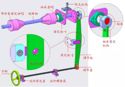 手輪+絲桿+絲桿固定座+絲桿螺母座+調節座+調節板+限位機構+軸承固定機構,這一套構成了布料卷的左右調節機構;