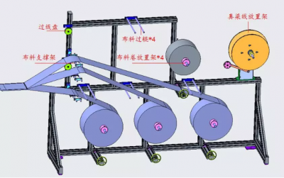布料從布料卷出來后,經過各自的布料過輥,最后從布料支撐架出去進入下一工序;鼻梁線從放置架出來,經過線盤進入下一工序。