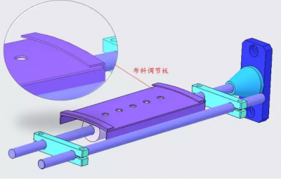 這個機構和原來不同的地方是多了一個布料調節板,我們可以看到調節板的兩端是折起的鈑金,布料就是從兩側折起的鈑金內通過,所以它的作用是可以防止布料左右竄動。