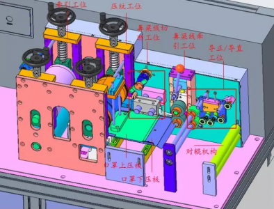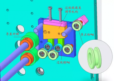 這個機構的作用就是將鼻梁線導正、導直,鼻梁線經過4個導正輪和2個過線輥,從導直對輥中間穿過,進入后面的牽引工位。(注:導直對輥是無動力的)
