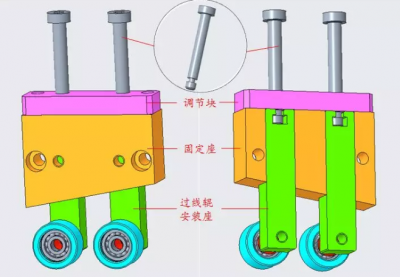 調節塊安裝在固定座上,可以看到調節螺絲和過線輥安裝座是燕尾槽式配合,當擰動調節螺絲時,就可以帶動過線輥安裝座移動,達到調節過線輥高度的目的。