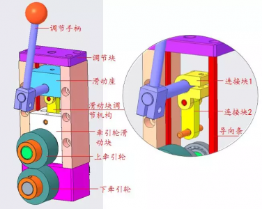 扳動調節手柄,帶動連接塊1轉動,連接塊1又帶動連接塊2運動,從而使牽引輪滑動塊和上牽引輪向上或向下,達到調節的目的。