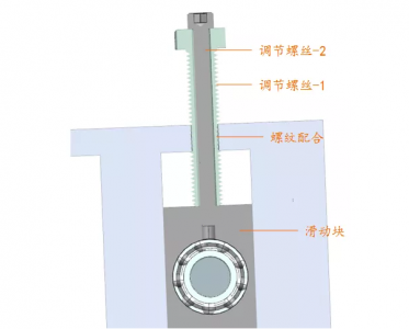 調節螺絲-1是中空型螺絲,調節螺絲-2和滑動塊為螺紋配合,調節過程:調節螺絲-2鎖在滑動塊上,但注意不要鎖緊;這時轉動調節螺絲-1(注意保持調節螺絲-2不轉動),就可以實現滑動塊的上下運動,調整到合適位置后,鎖緊調節螺絲-2就OK啦。