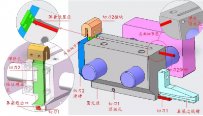 首先需要知道的是:鼻梁線從過線槽進入,從出口處出來;切刀2彈針是插入彈針孔的;彈簧放置位里有一個彈簧,位于彈針下面;限位螺絲孔處有一顆限位螺絲,用來保證切刀2不會被彈出去。