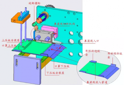 從上圖可以看到,口罩下壓板兩側分別有布料預折鈑金和折邊鈑金,布料經過預折鈑金時,將布料兩側折成接近90°;再經過折邊鈑金時,將布料蓋下來折成180°。