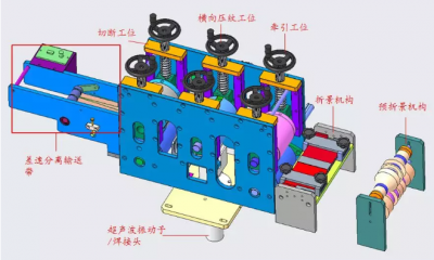 首先,對輥機構沒什么可說的,就是兩個滾筒,高度也是通過兩側的長圓孔進行手動調節。(這個機構沒有N95口罩機的對輥機構調節方便)