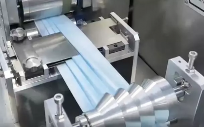 → 然后再經過折景/分段工序,折出口罩上的三道褶皺,并由超聲波熔接機壓出口罩橫向兩側壓紋,同時將口罩分段截取;