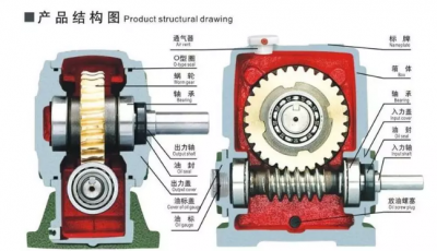 可以看到,兩個工序的動力都來自下面的電機+減速機,減速機的類型是蝸輪蝸桿式,下面是內部結構圖: