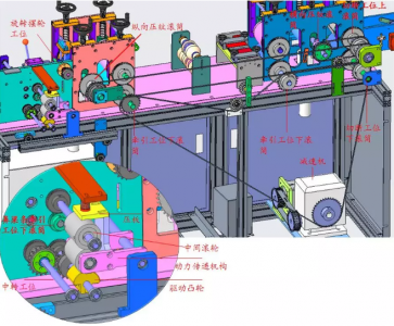 以上就是兩個工序的動力完整傳遞過程。再來看一下驅動凸輪帶動鼻梁條牽引工位的工作原理: