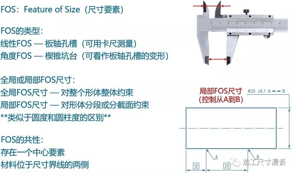 這里出現(xiàn)了一個(gè)名詞“FOS”,即“Feature Of Size”, 翻譯成中文可以叫做“尺寸要素”。我們來讓它更直觀些,舉個(gè)例子,線性FOS就是板軸孔槽(球環(huán))等, 它們有個(gè)特點(diǎn),就是可以用卡尺直接測量(夾住或撐住),并且存在一個(gè)中心導(dǎo)出要素,比如中心面,中心線,中心點(diǎn)等;而角度FOS如楔錐坑臺(tái)等其實(shí)可以看作是線性FOS的變形,比如一個(gè)板的兩面不平行,就變成了楔形,而一個(gè)軸的表面母線與軸線有了夾角也就變成了錐體。