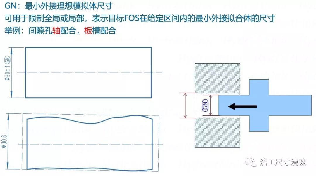 這位兄弟就很活躍了,適用于間隙孔軸配合的軸板槽配合的板,相當(dāng)于GD&T中的非關(guān)聯(lián)實(shí)際包容體(UAME)。它的物理含義很簡單,假設(shè)有一個(gè)軸類零件,我們用一個(gè)理想的圓柱去套住它,然后讓圓柱面收縮,一直到零件沒有任何的活動(dòng)空間,此時(shí)這個(gè)圓柱面的直徑就是GN尺寸。這里需要強(qiáng)調(diào)的是,如果是過盈或過渡配合,GN就失去了它的主要意義,因?yàn)榇藭r(shí)限制邊界跟保證裝配已經(jīng)失去了關(guān)聯(lián)。