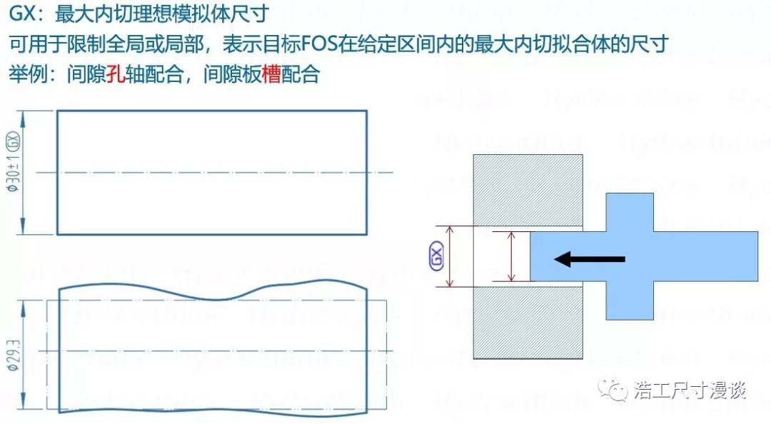 有了最小外接GN,自然少不了它的兄弟最大內(nèi)切GX,類似的概念,適用于間隙孔軸配合的孔及板槽配合的槽,同樣相當(dāng)于GD&T中的非關(guān)聯(lián)實(shí)際包容體(UAME)