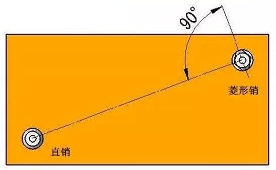 使用一個直柱銷和一個菱形銷的情況時,通常菱形銷的配置方向(與工件接觸處)的連線與直柱銷和菱形銷的連線垂直成 90°,這樣的配置方式是為了角向定位(工件回轉(zhuǎn)方向)。
