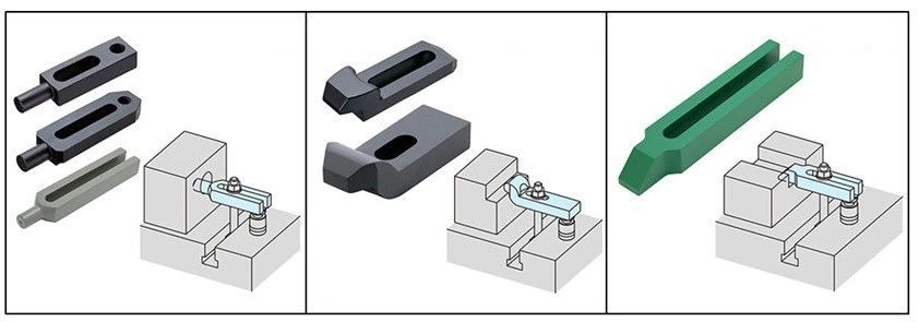 另外,可以根據(jù)工件形狀,選擇不同形狀的壓板對應各種不同形狀的工件。