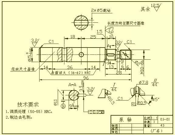 如圖中所示的表面粗糙度為Ra6.3的右軸肩,被選為長度方向的主要尺寸基準,由此注出13、28、1.5和26.5等尺寸;再以右軸端為長度方向的輔助基,從而標注出軸的總長96。