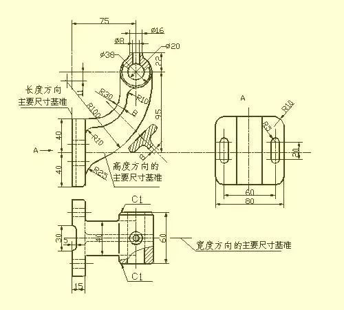 在標注叉架類零件的尺寸時,通常選用安裝基面或零件的對稱面作為尺寸基準。尺寸標注方法參見圖。