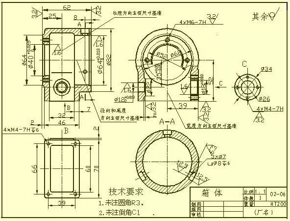 在標注尺寸方面,通常選用設計上要求的軸線、重要的安裝面、接觸面(或加工面)、箱體某些主要結(jié)構(gòu)的對稱面(寬度、長度)等作為尺寸基準。對于箱體上需要切削加工的部分,應盡可能按便于加工和檢驗的要求來標注尺寸。