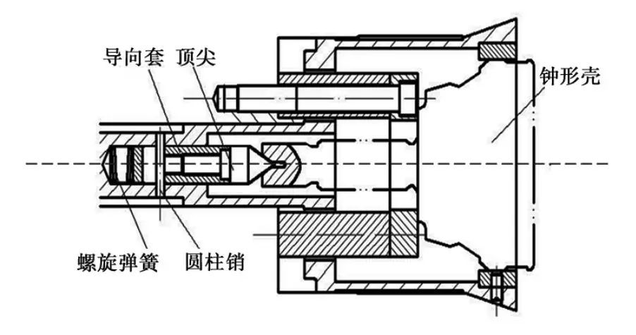 (3)工件完成加工后,彈性夾頭松開,在螺旋彈簧6的作用下,頂尖7將鐘形殼頂出;