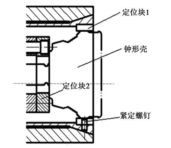 見圖4,定位塊1可有效地調節鐘形殼和夾具之間的徑向間距,定位塊2可以調節軸向間距,能加工不同尺寸的鐘形殼,達到提高夾具通用性和工件生產效率的目的。