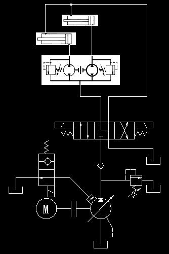 圖紙可能是帶安全閥的變量泵;液壓缸前的那組閥是同步馬達,保障液壓缸同步的。