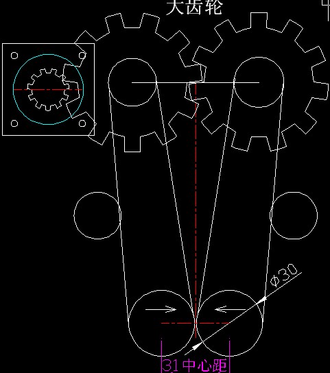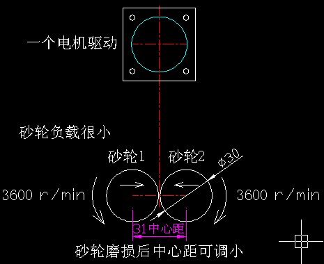 可用三個齒輪啊,電機帶一個,兩個砂輪各帶一個,這兩個都與電機帶的砂輪嚙合。