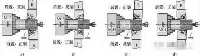 圖1a 所示為常見的右旋螺紋加工方式, 主軸正轉(zhuǎn)、前置正裝或后置反裝刀具、從右至左進(jìn)給。若進(jìn)給方向反向, 則為左旋螺紋加工, 如圖1b 所示。4 M) F; H7 k" v) t% q# g