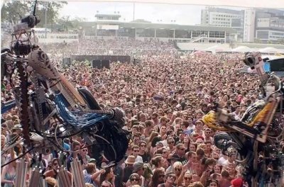 對了不僅如此,他們渾身都是拿廢舊材料制作的,除此之外他們還開演唱會,沒錯,演唱會的收入主要用來修復身體,畢竟開一場演唱會還是挺傷筋動骨的。你敢相信這是他們的演唱會場景嗎?