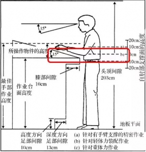 另外,對于需要手腳同時參加工作或經常需要完成前伸超過高于工作面41cm或高于工作面15cm的重復操作的工種,盡量設計為“坐姿工作”。