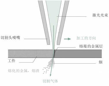圖1 激光束熔化工件,切割氣吹走切口中的熔融材料和熔渣