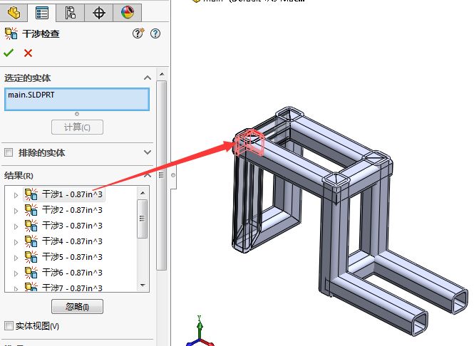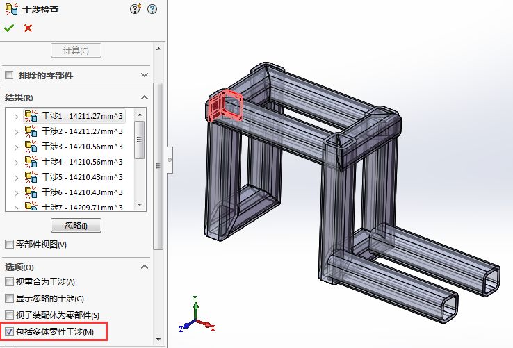 第二步:啟用裝配體的“干涉檢查”功能,勾選“包含多體零件干涉”,然后運行“干涉檢查”。