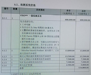 這套MIG焊并帶焊縫質量檢查功能的工作站我們是整套開發給客戶,裝配調試也到尾聲,這兩天是驗收階段,客戶也該付第二筆款(3-5-2的方式),但客戶老板看到的設備報價清單,其中因為有一項銳多視的激光檢測探頭售價五十多萬: