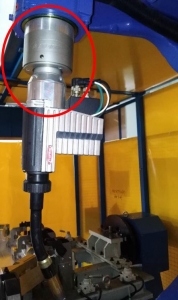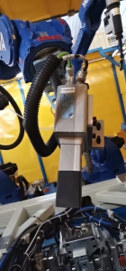 客戶老板也是懂點兒技術的人,他之所以能有這種想法,是因為在做的大多數MIG焊工作站,伏能士的CMT焊接,焊槍與機器人第六軸的聯接都有一個防碰撞的傳感器(如圖紅圈所示)