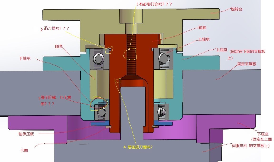 本帖最后由 用戶x 于 2019-10-16 11:59 編輯 這是承受軸向力嗎?確定用深溝球,圖1中黃色隔套有什么用,不可以直接和上座做成一體的嗎?藍色軸承壓板不能去掉直接用卡簧擋嗎? 1.臺階沒什么用,留著擋住軸承外圈即可,另一個直接去掉;2.軸套應該要磨,需要砂輪越程槽,但是一般不是這個形狀;3.深度夠的話不需要打穿;4.沒有;5.九十度是可以的,但是一般會有R0.4左右的圓角,由于軸承圓角較大,一般不影響,但也不可以完全忽略;6.如果受的是軸向力,兩個結構都不看好 本人半吊子水平,說的有問題的地方歡迎拍磚 |