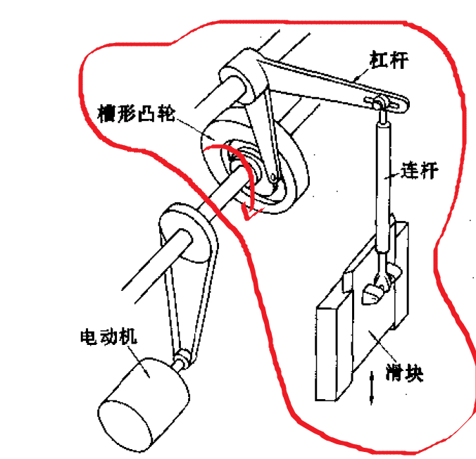| 活動件:凸輪,杠桿,連桿,滑塊。約束:凸輪高副-1,連桿與杠桿連接-2,滑塊與連桿連接-2,滑塊受上下活動約束-2,凸輪轉動約束-2.杠桿轉動約束-2,4*3-1-5*2=1 |