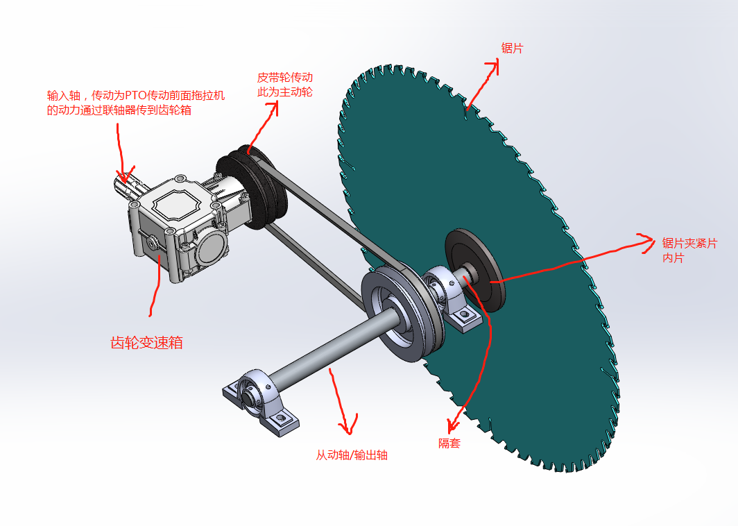 正文摘要:如圖是一臺PTO傳動的小型鋸床,圖中為主要的傳動部分,現在的需要是加入一個急停裝置(不是電器上的急停開關)因為鋸片的動力也就是齒輪箱的動力來源是前方的拖拉機或者其余機械,然后需要在后面皮帶傳動部分想辦法 ... |