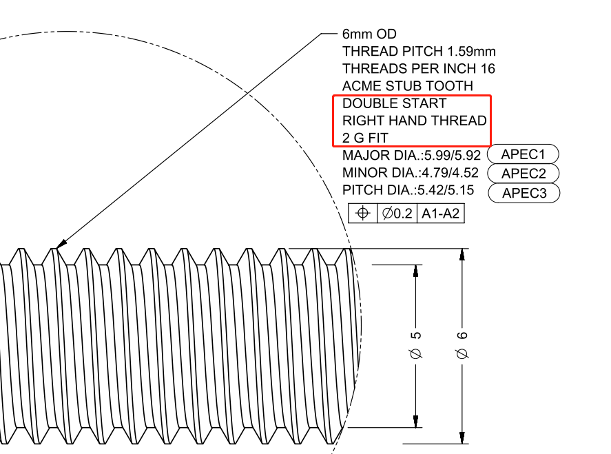2 G FIT 這句我的理解是螺紋的配合精度等級(jí)是G (g),因?yàn)槭请p頭螺紋,所以是2 G, 如果是單頭就只有一個(gè)G就OK,如果是3個(gè)頭,就要寫(xiě)3 G FIT 了。 FIT表示配合。希望能解釋明白了。 |