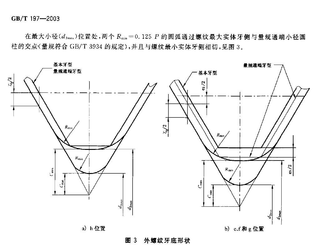 意思是說: 圓弧Rmin,通過點(diǎn)A(圖中紫色標(biāo)記)。而點(diǎn)A是螺紋最大實(shí)體牙側(cè)(黃色標(biāo)記)與量規(guī)通端小徑圓柱(綠色標(biāo)記)的交點(diǎn)。另外圓弧Rmin與螺紋最小實(shí)體牙側(cè)(紅色標(biāo)記)相切。 另外,這個(gè)標(biāo)準(zhǔn)現(xiàn)行的是2018了。