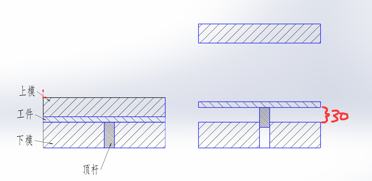 正文摘要:如圖所示沖模結構,工件是一個A4紙張大小的塑料薄片。沖裁成形后,頂桿頂出(可以有若干個頂桿),以便工件取出。 初步設想頂桿動隨著上模升降: 1.頂桿和上模一起上升到30mm處; 2.頂桿在30mm處就不動了,上模 ... |