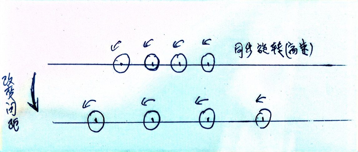 | 這個方法應該不少吧,簡單來說,帶,鏈,齒輪傳動都可以實現啊,你只要把在你要用的任意兩個輪子的中間設置一個惰輪,且與它兩側的輪子保持固定距離就好了啊。你要改變間隙就直接把那5個輪彼此拉開好了,如果想容易控制那么加一個貫穿五個輪子的的滑動桿就可以了 |