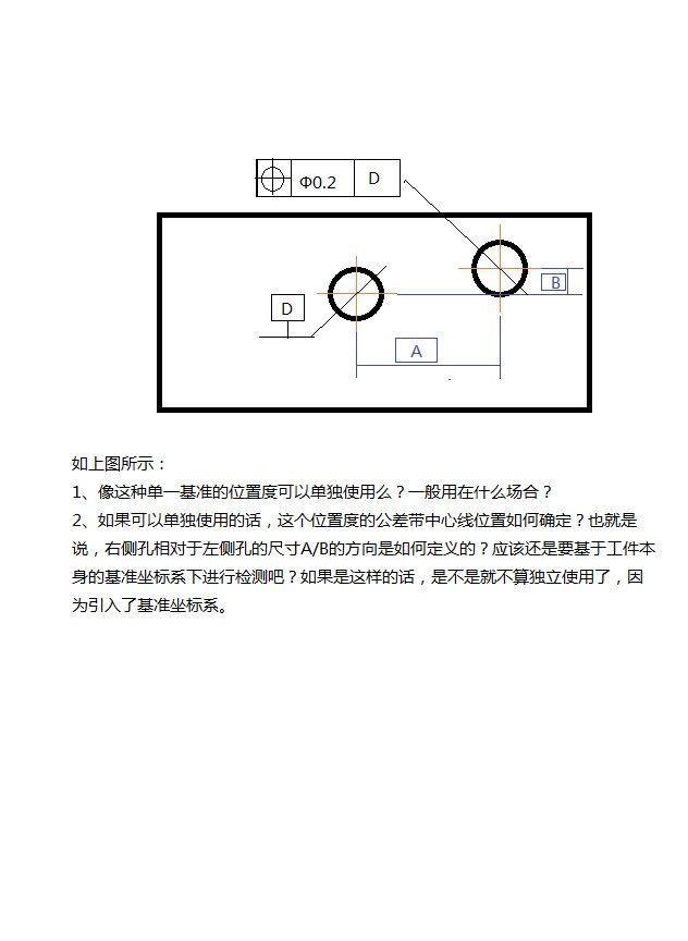 | 你這個光有D, 無法精確確定孔的位置。A, 和B的尺寸在測量時如何給定他們的方向? |