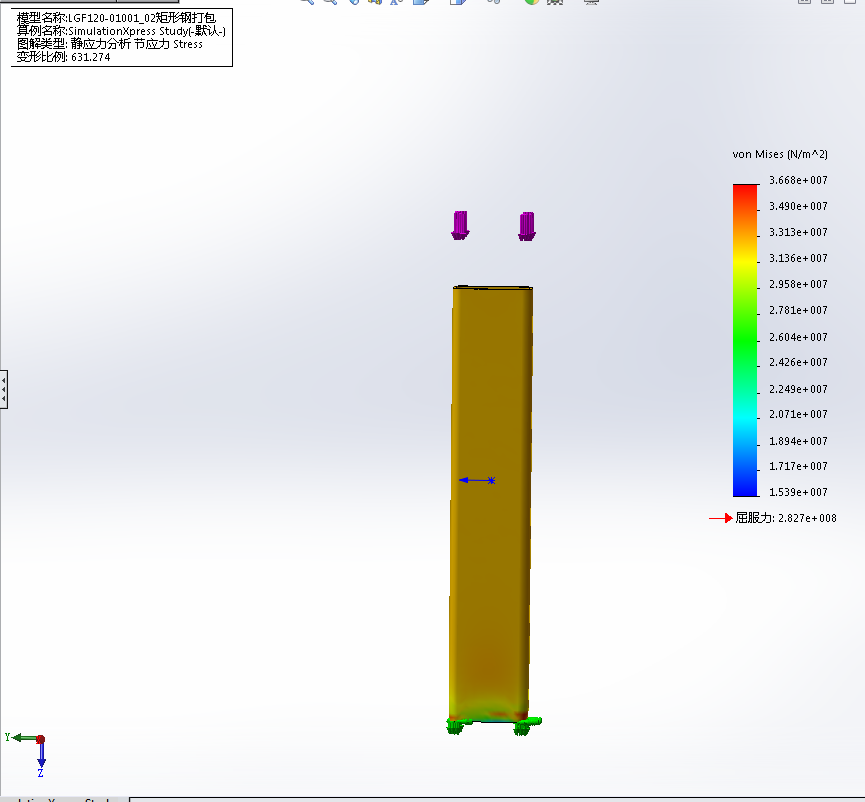 你這個受力狀態,不能用靜應力分析。當然,靜應力也可以分析。 但是也要進行屈曲分析,因為有可能會因壓桿穩定性不夠先失穩。如果穩定性夠,沒問題。然后再計算靜應力。一般情況下受壓都是足夠的。 另外根據經驗,我一般將能夠使用的標準規定為最大應力是屈服狀態的十分之一左右。這個里面考慮了一定的疲勞因素。因為一般情況下,無限壽命疲勞應力值約是屈服強度的十分之一左右。 這些書本上可能沒有,有大俠有不同的見解,歡迎討論。 當然,看這個應力圖,不能糾結與局部應力,比如尖角點,他不真實。根據材料力學,受壓狀態的應力,大部分是均勻的。所以這個圖棕色比較有代表性。 |