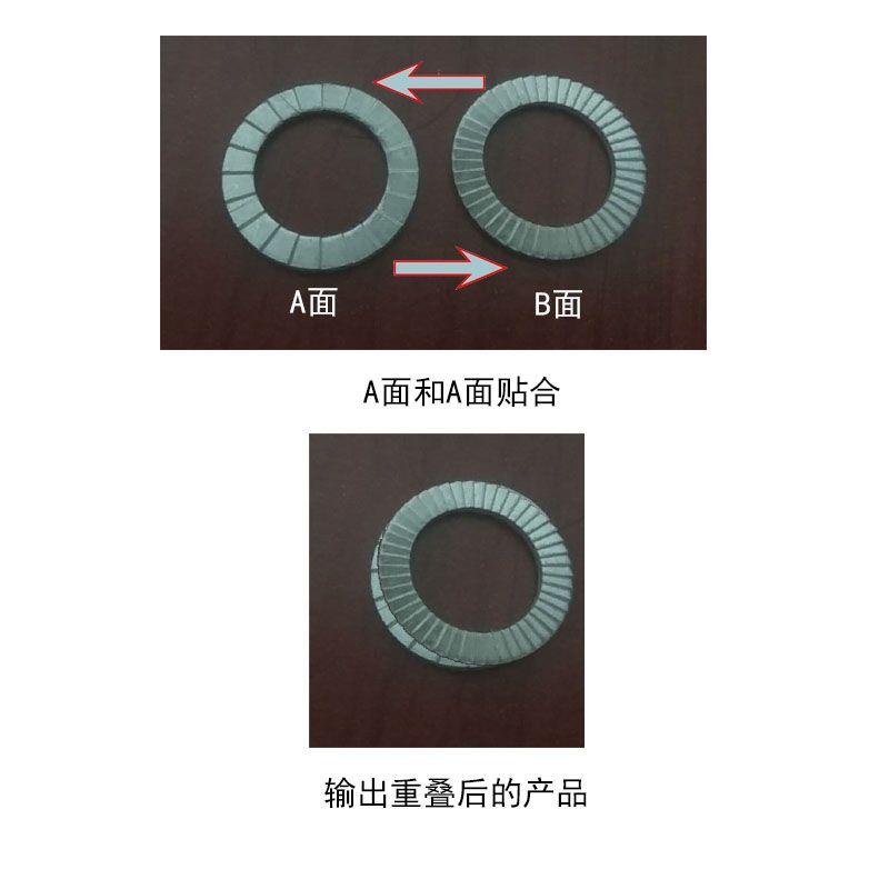 | 兩個振動盤出料一個正一個反,出料口做個小機械手把兩個疊一起 |