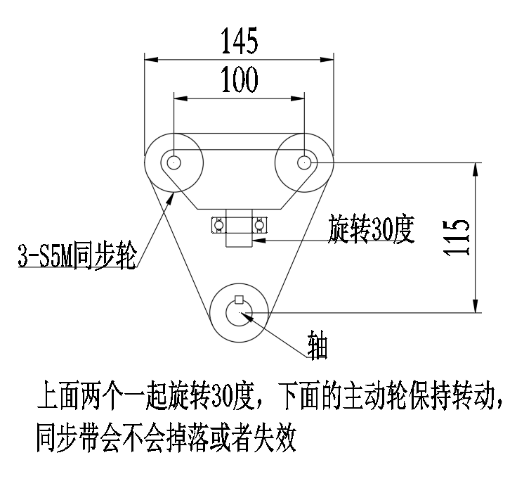 | 旋轉(zhuǎn)30是上面那兩個(gè)同步帶輪(保持中心距不變),繞你畫的剪頭位置整體向左向右轉(zhuǎn)30度嗎?同步帶是柔性的,旋轉(zhuǎn)后還能保持與帶輪的摩擦力,并進(jìn)行運(yùn)動(dòng)嗎? |